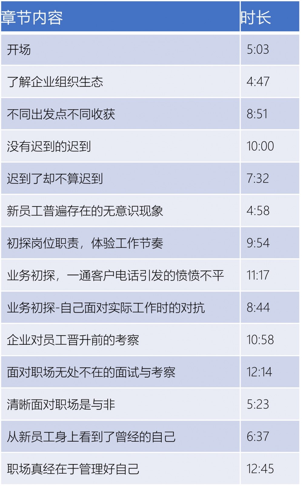 为了让我们更生动的了解企业现实、职场故事,课程以一名毕业生叶小琼入职新公司后的两年期间发生职场事件为线索,展开了职场新人一系列的情景故事,这里面有误解、有纠结,有不情愿,也有更深的职场思维的转换与思考,让学习者能随着视频故事的逐步深入,反观自己内心所想所获。